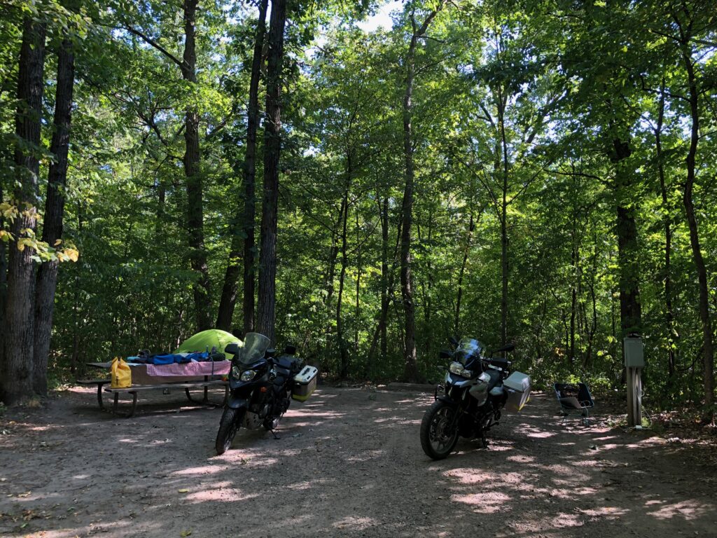 A quick google map lookup indicated it would take us about four hours of riding (with breaks closer to 4.5 hours) to get to the dealer the next day. While that’s doable, it’s a long ride when under a time crunch. We decided to get closer to Minneapolis to shorten our riding time and get to the dealer earlier especially since they are only open until 16:00 on Saturday. We found an available campsite at the Charles A. Lindbergh State Park about 125 miles further SE. Unfortunately, that meant no rest day after all, pack it all up again and leave Bemidji around 13:00.
